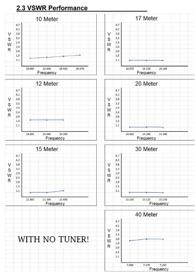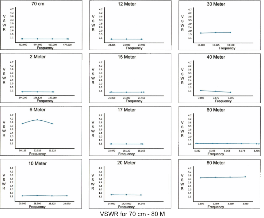 The 7 plots represent the VSWR performance of the antenna using 50 feet of quality RG-8X coax, 100W output power, with the antenna mounted approximately 27 inches above ground with no external objects, metallic or otherwise, within a 20-foot radius of the antenna. The term “bandwidth” here refers to the range of frequencies that the antenna covers.