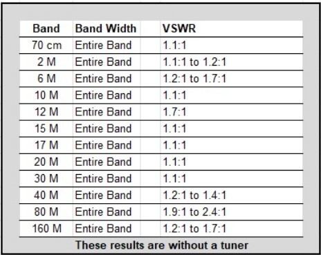 Overall, this antenna provides wide-band, multi-band coverage with minimal need for a tuner, making it ideal for operators who want simple setup, strong performance, and clean matching across a large portion of the spectrum.